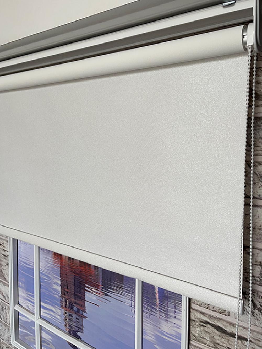 Bu Gümüş Simli Stor Perde modeli, standart zincirli mekanizma ile sorunsuz çalışır ve hem tavan hem de duvara monte edilebilir.